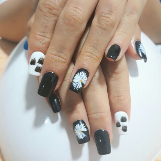 Mong Tay Giả Mẫu Hoa Cuc Hoạ Mi Trắng đen Handmade Nail Box Shopee Việt Nam