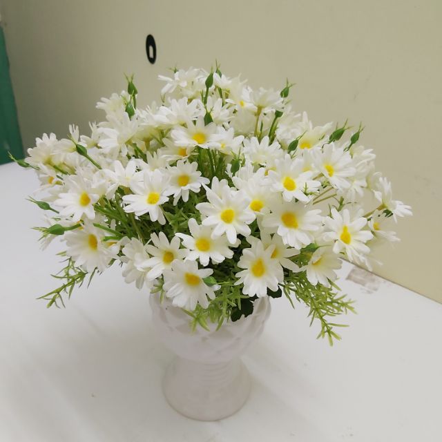 Hoa cúc họa mi. Mỗi cây cúc họa mi không có quá nhiều nụ nhưng khi được trang trí thành bó hoa cắm chậu hoa thì những bông cúc trắng nụ cúc nhỏ xen lẫn và nổi bật trên nền xanh của lá và cây đã tạo nên một tác phẩm nghệ thuật độc đáo thu hút. Cúc họa mi là loài hoa nhỏ thường mọc hoang vùng lạnh có những cánh trắng ngần từ giữa tỏa ra như hình nan hoa quanh một nhụy vàng tươi rất đẹp mắt. Ví von này lại càng làm toát lên được vẻ đẹp tinh khiết của mỗi bông hoa nhỏ. Và các bạn có biết không người ta vẫn ví những cánh hoa cúc họa mi như là cánh chuồn chuồn mọc xung quanh hị hoa màu xanh.