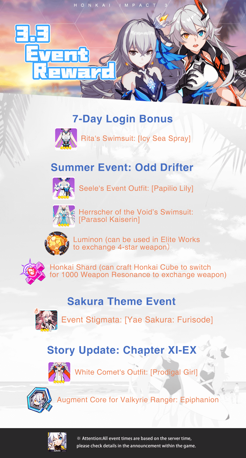 Honkai Impact 3rd On Twitter Get Free Summer Outfits For Herrscher Of The Void Rita And Seele In Version 3 3 Events And More Rewards To Be Claimed In The Upcoming New Version
