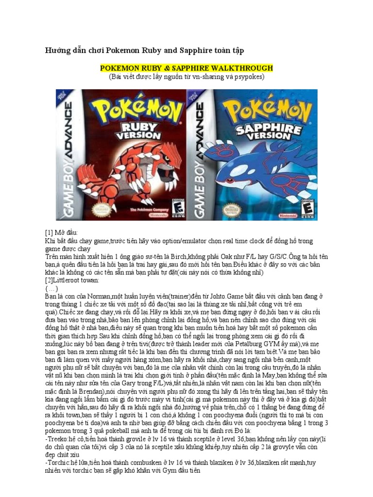 Hướng dẫn chơi game pokemon ruby sapphire part 3 seaflooor cavern xong rồi thì suft xuống phía nam đến một vùng nước đen có thể dùng dive bạn lặn xuống rồi tiến về phía nam đến một của hang bạn vô đó và trồi lên bằng nút b rồi vô hang. Hướng dẫn chơi pokemon ruby and sapphire toàn tập part 3 nino24 hướng dẫn chơi pokemon ruby and sapphire toàn tập part 3 nếu qua rusturf tunnel khi ra khỏi hang bạn sẽ được ông staff hồi trước thông báo có 2 loại ball mới ở mart rustboro là repeat ball và timer ball. Hướng dẫn chơi pokemon ruby and sapphire toàn tập part 1 hướng dẫn chơi pokemon ruby and sapphire toàn tập part 2 hướng dẫn chơi pokemon ruby and sapphire toàn tập part 3 sau màn nói chuyện hãy đi lên tầng và ấn vào chiếc đồng hồ để chỉnh giờ. Games được cải thiện từ rom gốc để làm tăng độ khó của game nói thật cái game gốc quá dễ 3.
